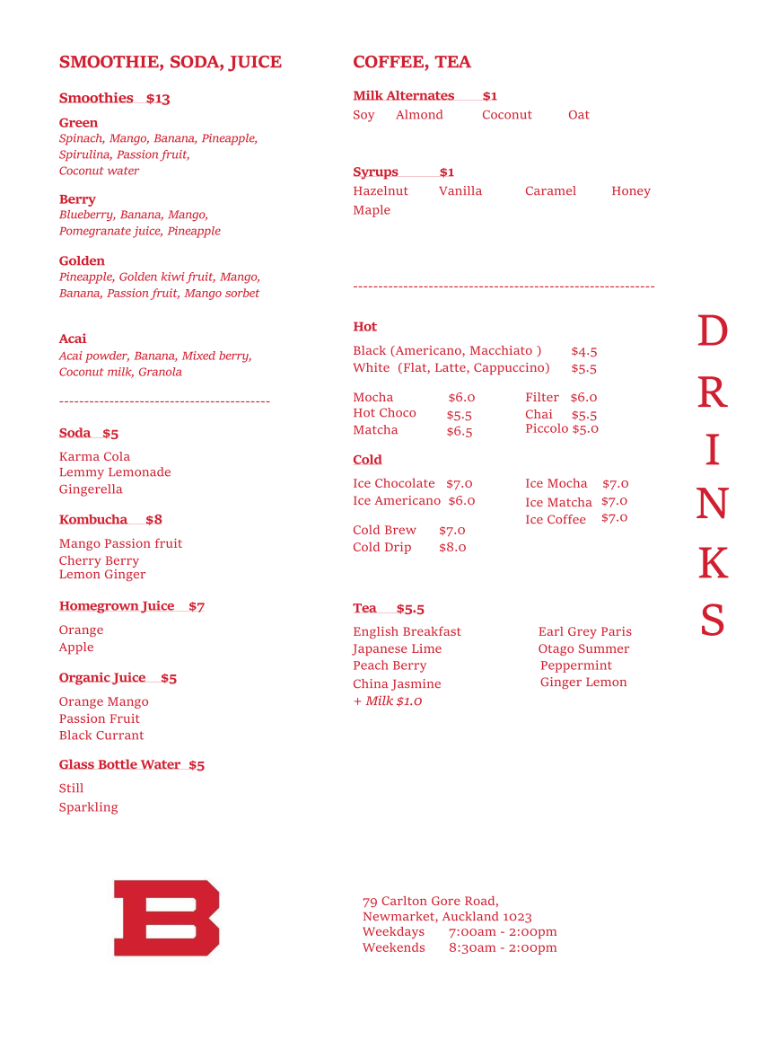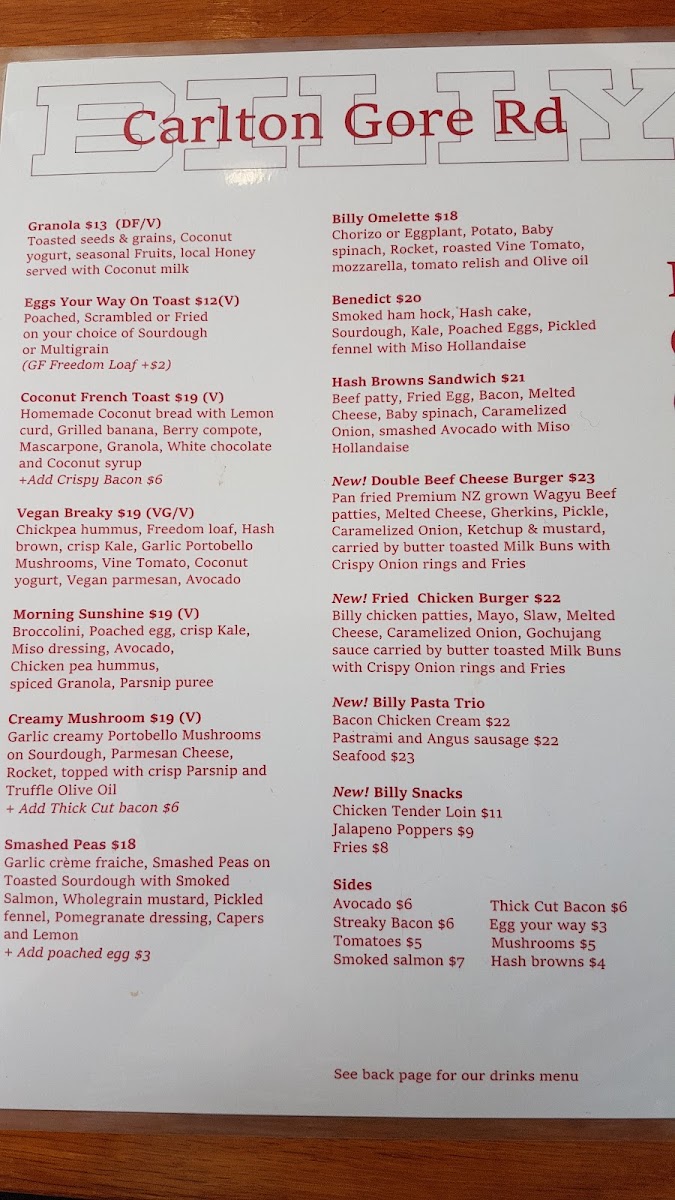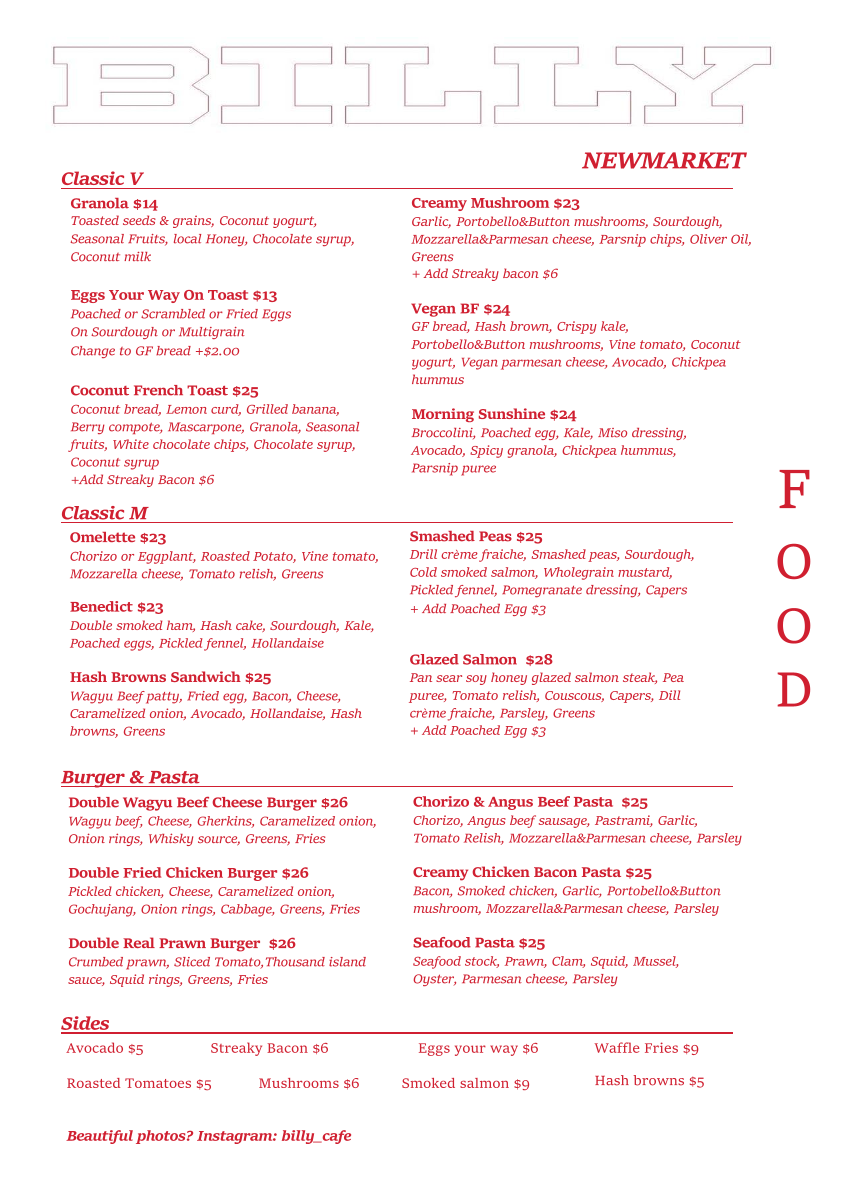 In conclusion, Billy Café’s menu offers a great blend of flavors, catering to both savory and sweet cravings. Whether you’re after a hearty meal or a quick snack, their selection of burgers, pasta, smoothies, and drinks makes it a perfect spot to enjoy delicious food in the heart of Newmarket.