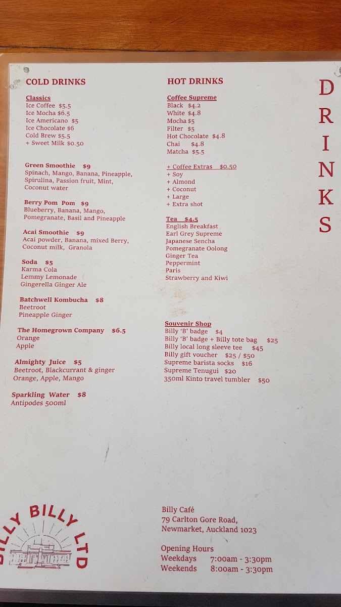 Billy Café also features an extensive range of Hot Drinks, including Filter Coffee, Hot Chocolate, Chai, and Matcha for those seeking warmth and comfort. For a little something extra, the Souvenir Shop offers a selection of fun items, including the Billy 'B' Badge, Billy Local Long Sleeve Tee, and Billy Tote Bag, along with a Billy Gift Voucher or Supreme Barista Socks to remember your visit.